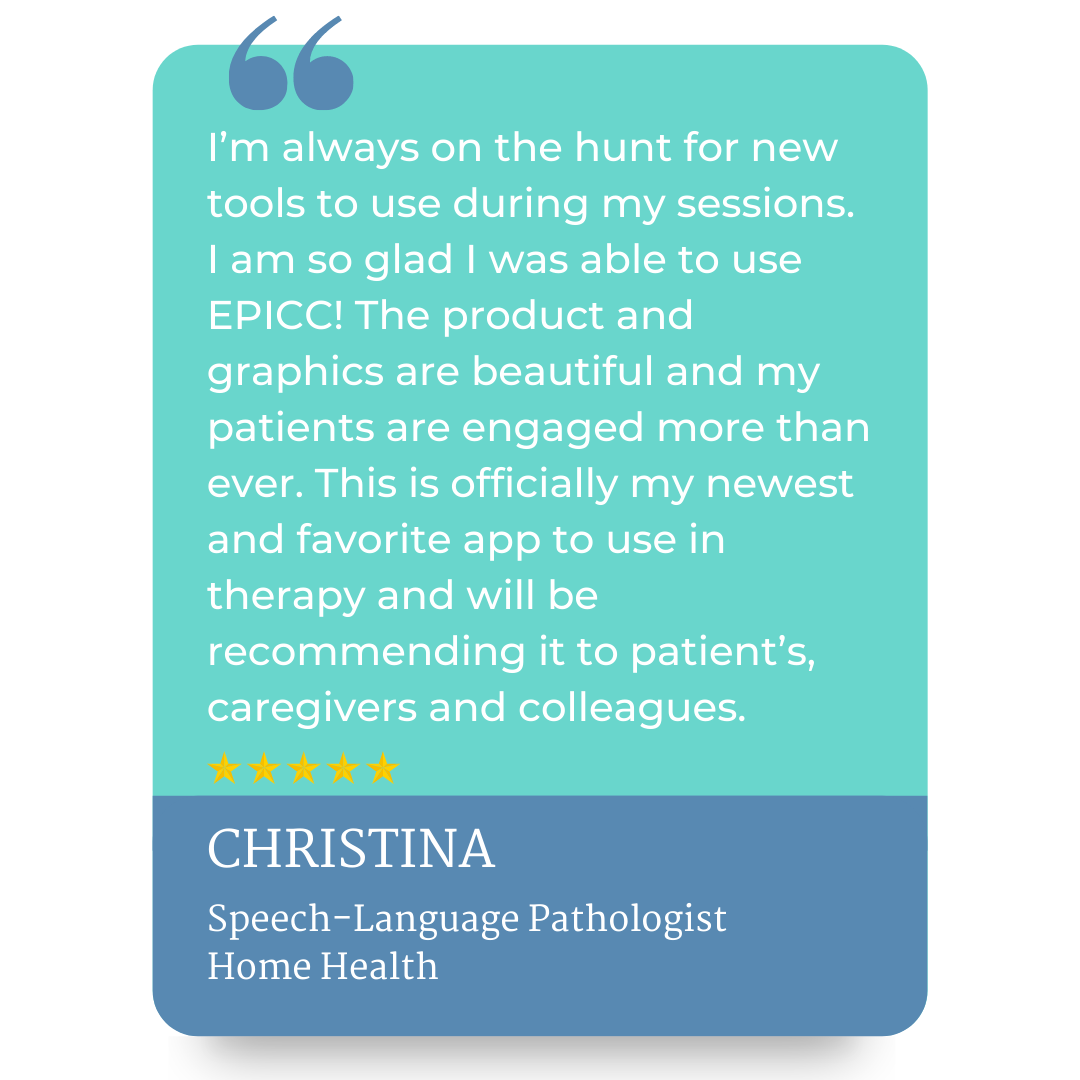 EPICC® is a mobile app designed to increase the language, speech, and cognition in individuals with neurological conditions. This program leverages practical scenarios and functional therapy to stimulate growth.